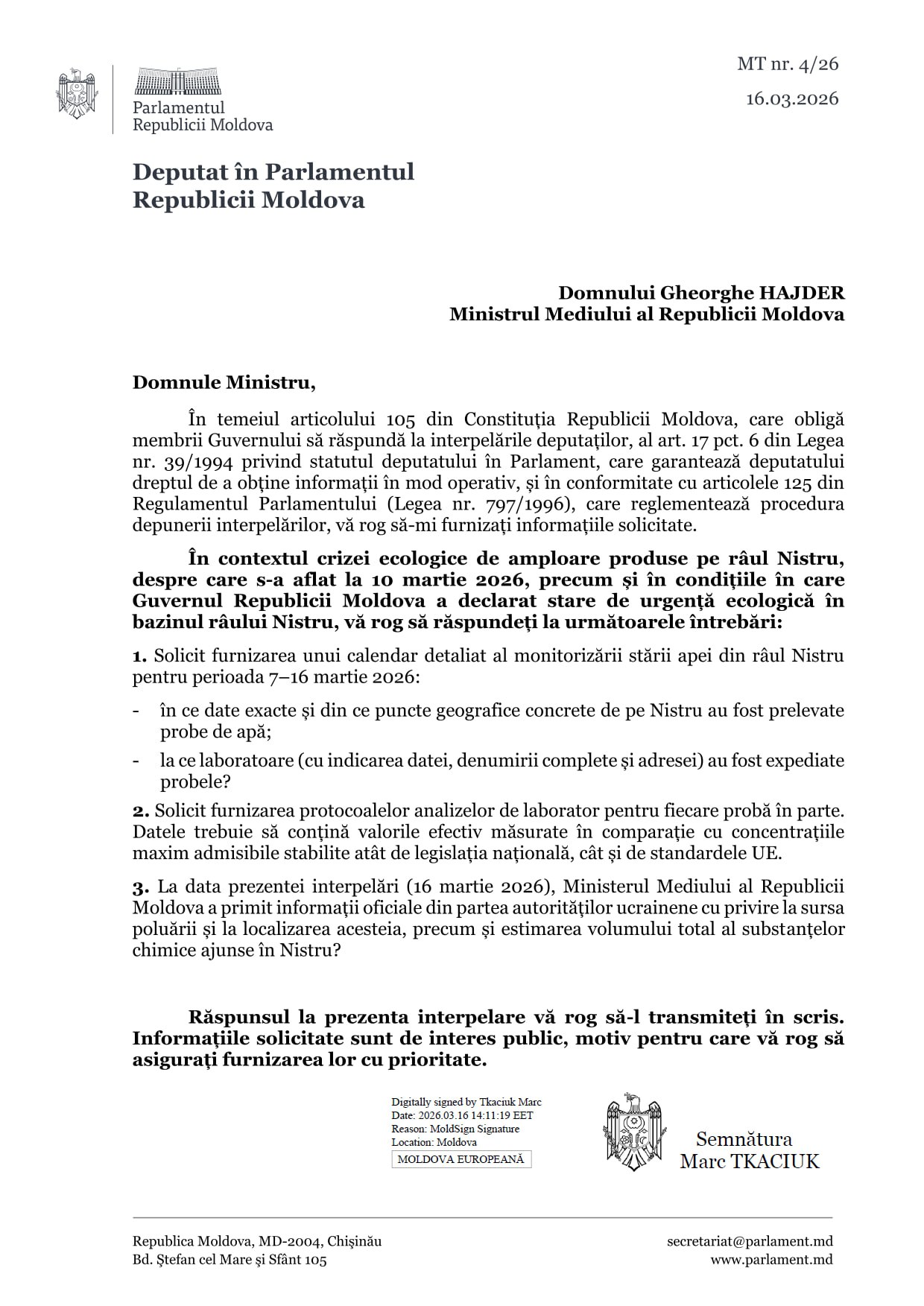 3. На дату настоящего обращения (16 марта 2026 года) получило ли Министерство окружающей среды Республики Молдова официальную информацию от властей Украины об источнике загрязнения и его локализации, а также оценочный общий объем химических веществ, попавших в реку Днестр?